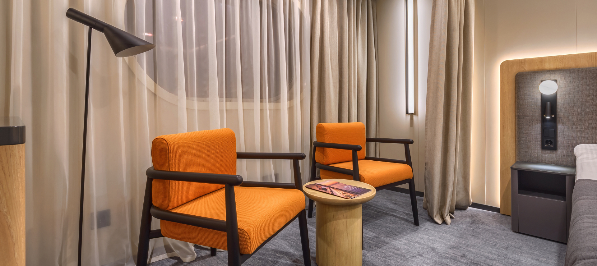 Vodohod took into account the demand for adjoining cabins and designed cabins with an internal transition door to create a two-room suite. On Nikolay Zharkov’s board, guests will be offered 6 pairs of Deluxe connecting cabins with no balcony.