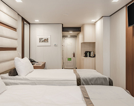 Stateroom is equipped with AC, wardrobe, occasional table and 2 arm-chairs, coffee machine, teapot, 220V sockets, TV, radio, safe, telephone, hair dryer, minibar, vanity table.