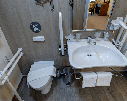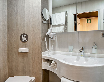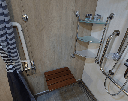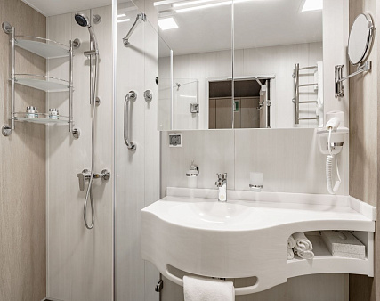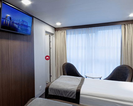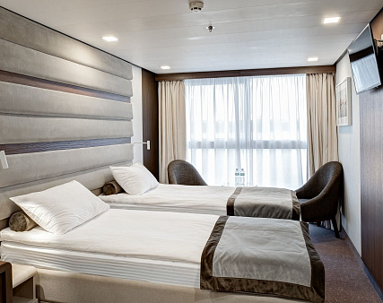 Spacious twin/double stateroom with floor-to-ceiling windows and extensive bathroom with shower (accessible for disabled guests).