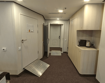 Stateroom is equipped with AC, wardrobe, occasional table and 2 arm-chairs, coffee machine, teapot, 220V sockets, TV, radio, safe, telephone, hair dryer, minibar, vanity table. Area 19 m2 (204 ft2)