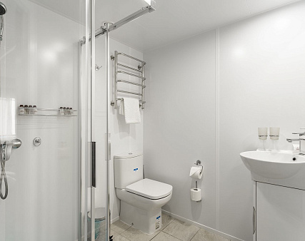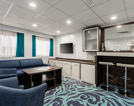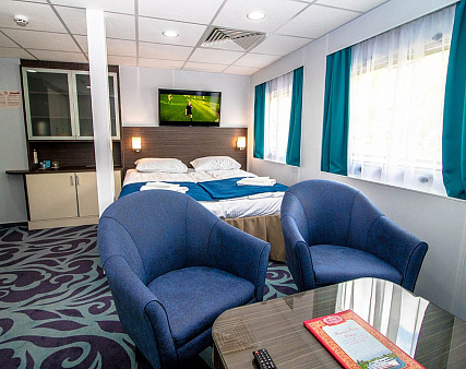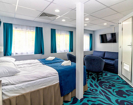 2-room cabin with separate bedroom and lounge area, 26 square meters, equipped with private facilities, heating and ventilation system, 220 volt sockets, radio, 4 large opening scenic windows. Lounge area is furnished in a stylish way with 2 armchairs, an occasional table, a sofa, cupboard with cutlery, TV/video, refrigerator. Bedroom is furnished with a king-size bed, a puffing stool, a roomy wardrobe, 2 bedside tables and console-mirror. Spacios bathroom (appr.5 sq.m), furnished with large mirror and two cupboards, a bathtub (can be used as a shower cabin). Suite can accommodate up to 4 people.Extra bed type - folding-bed (150*190cm).