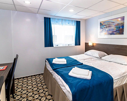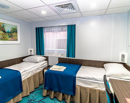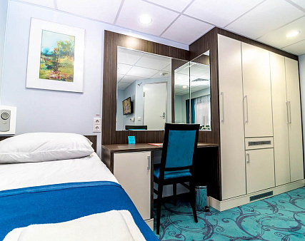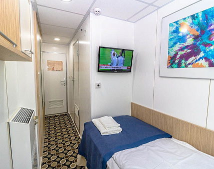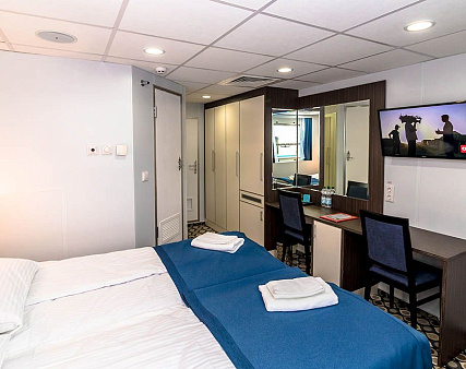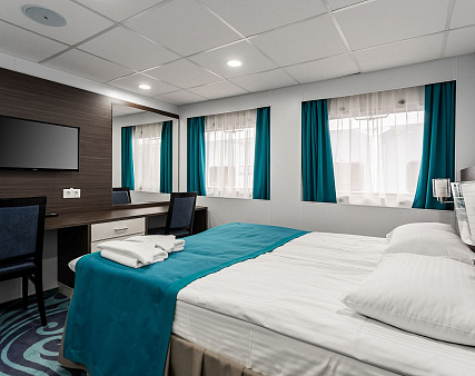 В каюте: кровать, шкаф для одежды, трюмо, телевизор, холодильник, сейф, радио, фен, одно обзорное окно, электророзетка на 220V. Двуспальная кровать размером 160х200 см, площадь каюты 15,5 м2