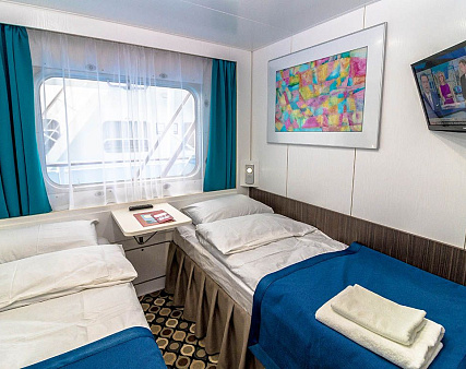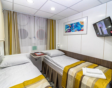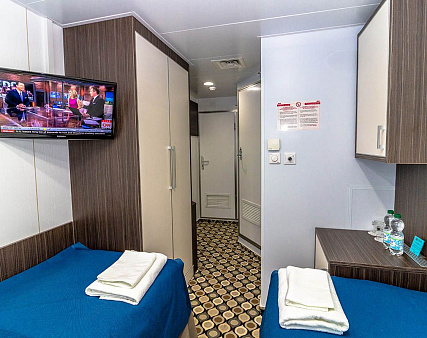 Stateroom is equipped with two non-convertible beds, 1 folding pullman bed, private bathroom with shower, AC, wardrobe, 220V sockets, hairdryer, safe, fridge, TV and radio.