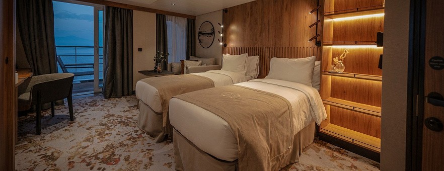 Каюты с балконом: Просторные номера площадью 25 м² с собственным балконом (5-6 м²), откуда открывается потрясающий вид на океан.