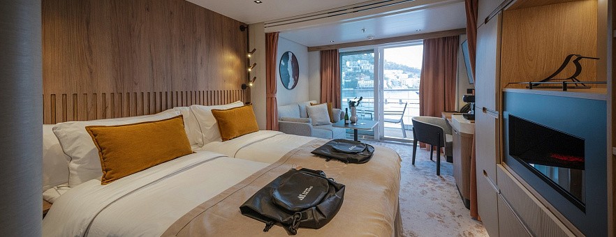 Благодаря наличию панорамного балкона 5 кв.м. каюта всегда наполнена светом. Зона спальни оснащена двуспальной кроватью, конвертируемой в две односпальные по запросу, и оборудована голографическим камином с эффектом живого пламени. Уютная зона гостиной располагает диваном и кофейным столиком. Завтрак на собственном балконе, отдых в зоне гостиной после насыщенного дня или послеобеденный сон – комфортное зонирование каюты позволяет гостям следовать собственным биологическим часам и не зависеть от планов своего спутника. Элегантная ванная комната оснащена душевой кабиной.